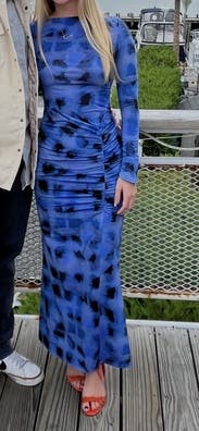 I really liked this dress, which features a comfortable stretchy fabric, vibrant blue hues, and a design that exudes both sexiness and elegance. The ruching is perfect, and I would definitely rent it again.