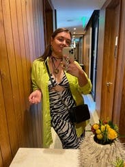Easy dress to put on and dress up or down. I went with the Medium since I wasn't sure if my sister was going to where it on our girls trip. I ended up wearing it to dinner and dancing after. The dress is a little thicker but not overly warm, thankfully. A guy at the club joked if I skinned a zebra for the dress. lolz!