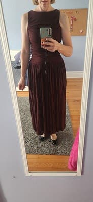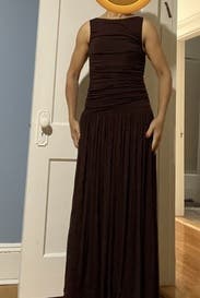 I rented several options for a wedding and didn't end up wearing this one. The fit was off pretty much everywhere. Oddly puckered across the chest. Rouched waist was fine but it also was drop-waisted so it just looked oddly long through the middle. The fabric was comfy but stretched due to its weight so it was saggy around the arm holes. Just off in so many ways. Loved the color though.