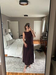 This maxi had so much potential, but for me, it was way too long. Like almost dragging on the floor long. The ruching is flattering but as the day went on the weight of the fabric pulled the ruching down and nearly made a puddle of knit fabric almost to the ground. If it were 6” inches shorter, it would have been a completely different story. Tall girls, give it a shot.