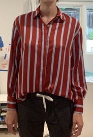 Great oversized button down. Luxe silky fabric. It's pretty long, but tucks really well.