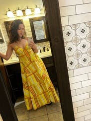 A bold yellow and orange plaid gives this elegant tiered maxi by S/W/F a retro feel.