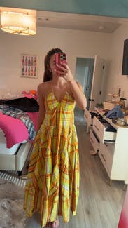 Such a cute, flattering fit and fun to wear! The fabric is beautiful and will need ironing…. The straps are thin and need to be tied tight around your neck (if that’s how you decide to tie) and can pull a bit because of the weight of the dress. Otherwise perfect!! Awesome rental!
