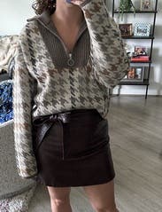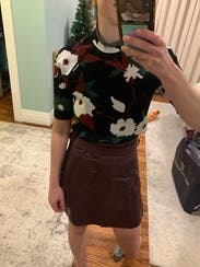 Cute skirt. Got lots of compliments. It is a great color. It’s maybe a tad short but with tights I thought it looked great for a fall or winter outfit. I wish the belt was removable. Thought it was too bulky to put in a bow and ended up just wrapping it around and trying to sort of hide it. Overall liked it and worth it even with the flaws. Fits small so size up. Got an 8 in this and it fit but it was definitely a bit snug. For reference - I am a true pear shape. More of a small/4 up top and a medium/6 on bottom (though a little heavier than usual right now so probably more of a 6 on top and 8 on bottom)