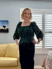 Green and black plaid cotton (56% Cotton, 44% Polyester). Top. Off-the-shoulder neckline. Three-quarter sleeves. Pull-on. 25" from shoulder to hemline. Imported.