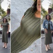 I didn’t end up wearing it for the event I rented it for because I wasn’t crazy about the olive green color. The pattern of the knit is very pretty though. This had good stretch and is very forgiving. I wore 1 size up (M) at 32 weeks pregnant (for reference I currently weigh about 160lb and 135 pre-pregnancy).