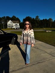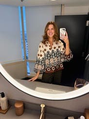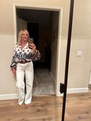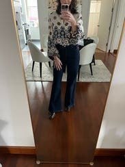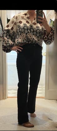 I loved the pattern and fit on this blouse. It felt perfect for a fall transition piece. I wore it with blue jeans as well as these colored jeans for two different looks. 4 stars because the fabric felt really synthetic. The look could have been elevated if the blouse was silk.