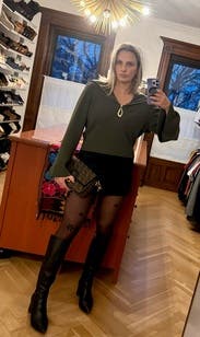 I waited for quite some time to rent this in the correct size and yes, I bought it. It’s actually pretty classy, looking with the gold hardware on the zipper. Looks great with high waisted super wide like jeans. I would definitely recommend renting it a staple for your closet.