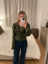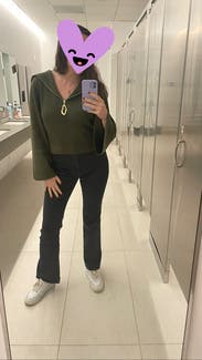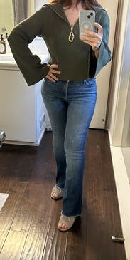 Loved this - a trendy basic but elevated sweater. Slightly short but not on me because I’m petite. The neckline was very flattering, sleeves were slightly long.