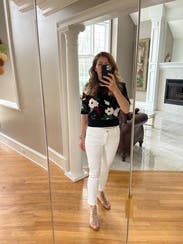 Style this woodsy floral sweater shirt by Tanya Taylor with white platform loafers to top off the style with the look with a mod twist.