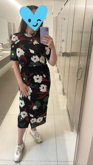 I got SO many compliments on this set. Form fitting very flattering. Should have got a medium for a little more comfort at work.