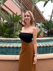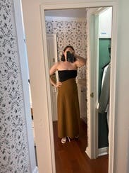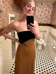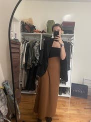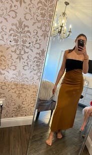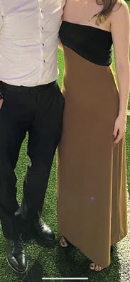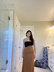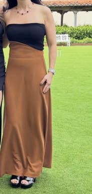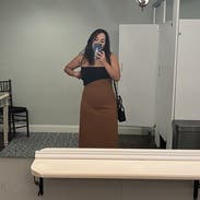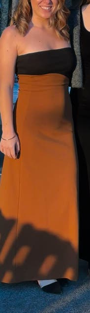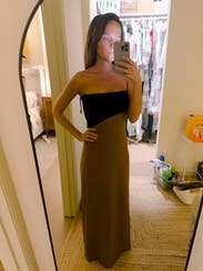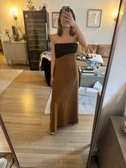 Liked this dress for the straight across strapless look softened by the asymmetrical black top that has a slimming effect. Really into the 90s brown. Going to wear for a rehearsal dinner. I’m an A cup and it feels right enough to stay up. Win.