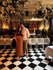 Wore 8 months pregnant to a party(took regular size). The chest bunches up a bit, but overall the dress is super comfortable (has a lot of stretch). Got compliments all night.