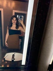 Wore this to my brother’s rehearsal dinner! Super flattering but not forgiving in the stomach so wear spanx. Chest ran a bit large and I had to use some tape to keep in place. Overall, very happy and got lots of compliments !