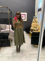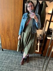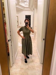 The dress is a beautiful olive color, and the length was perfect for my height. The contrasting textures of the top and bottom are flattering for the waist. I do wish it had pockets. However, there's a lot of excess material in the skirt, which can make it look a bit voluminous when sitting. Also, be prepared for a lightly wrinkled look.