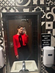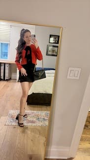 Super fun piece! The bold red color and black velvet bow add a playful touch. I wore it with a black mini, tights, and black boots. The red really popped and added the perfect touch of color. Got lots of compliments! You can easily dress it down with jeans for a more casual vibe. Fit-wise: I'd say it's true to size. However, I have wide shoulders, and it fitted perfectly, so if you have narrower shoulders, you might consider sizing down.