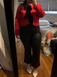 Didn't have a reason to look nice, but wanted to wear this before sending my shipment back because I love its boxy fit, ladylike velvet bows, and bold color. So I put this on over my workout outfit and felt like I was tearing a hole in the space time continuum in a really good way. This lil jacket makes me feel powerful and cool and it feels like it would be a really fun piece to own if I could afford it. Even though it has a boxy shape, I found that I needed the size 12 (typically I'm a 10 sometimes an 8) for my broad shoulders/bust, and it's still a bit restrictive in the way that structured jackets often are. It's fairly cropped but I think the whole construction is dope.