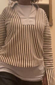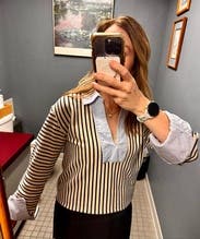 Such a fun twist on a classic work shirt. Striped part is like a stretchy sweatshirt material framed with the more classic cuff and collar