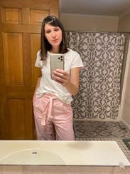 Sad that mine didn't arrive with the belt, because I really needed it to cinch the waist since the rest of the pants were pretty baggy. It was an unusual fit, as the pants were quite big except for a small section at the things where the fabric pulled. It's a pretty pink but these had been worn a lot. Opt for another high waisted pant - they have cute ones in lavender.