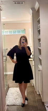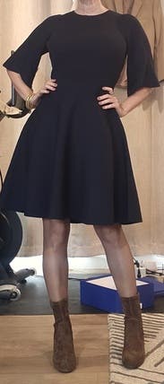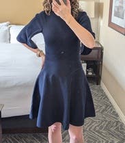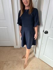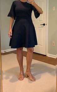 Such a flattering dress. I wore this to a work event. Loved the flared skirt and scalloped sleeves. Easy, polished look. Beautiful navy color.