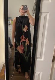 I wore this dress everywhere - a work trip, my birthday brunch, a retirement party, around the house. It is so flowy and truly stunning. It’s flattering albeit shapeless, but the beautiful flower motif makes it feel intentional vs. sack-like. The mock neck & long back ties (around the back of the neck) just class it up even more. LOVED it and can’t recommend enough!