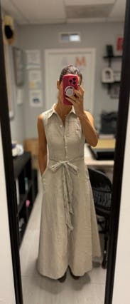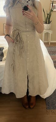 Loved this dress, but it was a pain to iron. Probably would have been easier to steam. Classic tan and cream pinstripe as we transition into fall. If you have a chest at all you may need to size up. I am a B cup and it pulled a little on me. I am typically a small or medium, so maybe the medium would have fit better in the chest, but this fit perfect in the waist and arms.