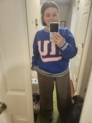 I’m not a big giants fan but this looked comfy so I decided to rent it and I’m so glad I did. It is the PERFECT material. If I was a fan, this would be perfect for game day at home or with jeans to the game. Idk. Rent it. A little oversized but perfect