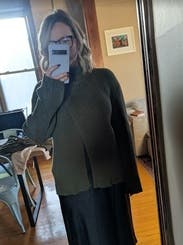 I wore this sweater on a work trip to Sonoma in the fall. I paired it with green “leather” pants. It was perfectly oversized, not itchy whatsoever and just screamed quality. The slit can open though, which is fine with a high waisted pant. If I lived full time in a colder climate this would be purchased.