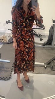 I got so many compliments on this dress. It’s a comfortable and stylish silhouette. It is a tad big but could belt it or size down. I am top heavy and some times struggle with button up dresses but there was no pulling or gaps