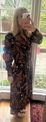 The pattern, colors and fabric are gorgeous. The fabric is substantial and soft but not too heavy—perfect transitional work dress. I’m solid 10 so I sized down which was good brava use it’s a lot of dress! Not recommended for petites as it is very long (sleeves and skirt). The shaping at the back helps. Wasn’t sure I liked it on but wore it anyway and have received multiple compliments