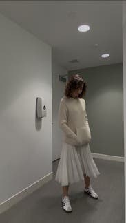 I loved the color and the feel — a nice thick, well made knit — but the fit was so off. I’m a small chested girlie, but there was so much material around the shoulders & chest, that looked really imbalanced with the tighter gathering at the wrists. However, my biggest issue was the length — it was awkwardly slouchy & ended up hitting my upper thigh/lower belly in a very unflattering way.. Overall, I had a difficult time styling this 😕