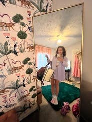 At first upon getting the blazer set it was a little wrinkly but after putting it on I absolutely loved it! I wore it to school for a meeting, and noticed that the material is thinner than other blazers I’ve rented in the past and I loved it, it’s perfect for warmer weather. The color is also great for spring and the blazer was just the right amount of oversized. I did size down 1 size in the blazer and it fit perfectly!