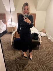 So chic for the office, date night and anything in between. The slit isn’t that noticeable when standing but as soon as you sit it’s difficult to maneuver. The only reason I didn’t keep this.