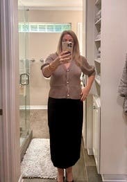 Loved this skirt so much I ended up purchasing it! The length is perfect—professional yet flattering—and the fit makes it feel effortless without being over the top. I styled it with an oversized striped blouse and t-strap heels for work, and it balanced chic with polish perfectly. Such a versatile piece that transitions easily from office to evening or summer to winter.