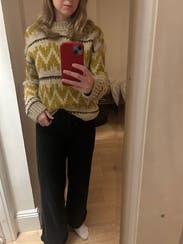 I hated this at first because the stitching on top horizontal line is very wonky and I thought it was defective (as you can see in the pic). However, I didn’t want to waste the rental, so I wore it to work, and I appreciated the warmth and coziness as soon as I walked into my freezing-cold office. It’s very comfy and soft (albeit a little itchy around the neck), but kind of boxy. I tucked it in and wore a belt, otherwise it would have made me look huge (because, as usual, I ordered too large of a size).