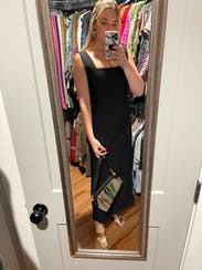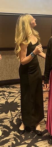 Rented this on a whim when I realized I didn’t have anything to wear to a black tie wedding and it was so insanely flattering on. I’m normally a solid medium but sized up and am so glad I did- a medium would have been too small. It’s the perfect black dress for a wedding!!