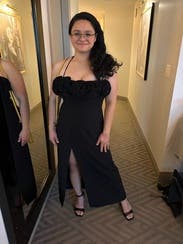 Petite friendly and TTS gorgeous black gown; easy to dress up and down-perfect for a Casino date with my hubby and looked as beautiful sitting down in my wheelchair as standing, an absolute win! Must rent for any formal, evening, or everyday wear to glam up your day! Cannot recommend enough-such comfortable material and fit and the slit was perfectly placed and fitted.