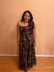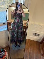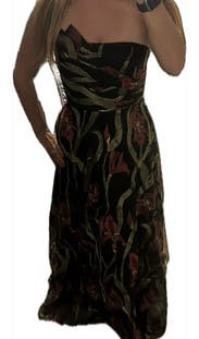 Rented this dress for a formal wedding and I absolutely loved it! The bodice was fitted enough so it didn’t feel like it would fall down and I was able to comfortably dance. I saw a few reviews that it was tight in the bust so I did order a size up for my backup size but didn’t need it. I know one review had mentioned it’s darker in person than you’d expect which I do agree with—it’s a very dark black but brightened with the green and maroon design. It is a flowy and comfortable dress, I’m really happy with my choice.