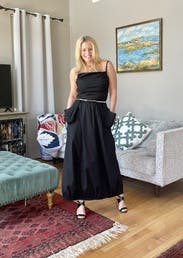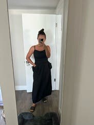 I liked this and found it easy to dress up or down. The backless feature is great in the Texas heat and the fabric was also nice and breezy. I was a bit worried about the side pockets but they actually laid pretty flat and weren't too poofy. The shoulder straps were a bit loose so had to adjust occasionally but nothing too bad.