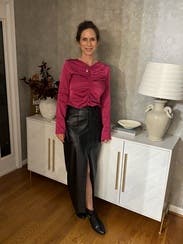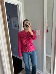 This top felt very nice and so soft! Great berry color. Only downside for petites is that the sleeves were way too long. I cuffed them, but they didn’t stay long, but my bracelets held them back some. Great tip, better than expected.