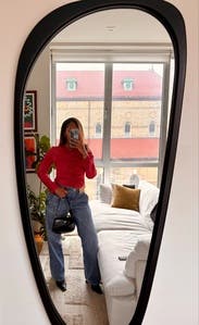 The color, the fit, everything about this was amazing. The picture isn’t great. I wore it to dinner with heals and slimmer jeans but I also wore it to a casual evening