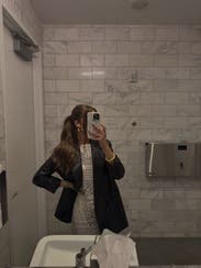 Loved this dress so much. It fit like a glove when I first put it on and then did stretch out/relax just a tad over the course of the evening so if you think you’re between sizes, I might size down. It also wrinkles easily but the wrinkles fall out easily too, so that wasn’t a big deal to me.
