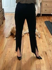 Love the ankle slits. Makes these regular black pants unique. Nice for too and a good length with heels.