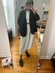 I was initially surprised it was nylon/silky but once I got over that, I wore this skirt so many times. I love a garment that is a bit unexpected and this did not disappoint. I took in on a long weekend away and wore it to dinner with a cute tank and a leather jacket, to the beach with flip flops, with the cut-out tank (in the photo) and sneakers to a BBQ, and to a wine tasting. I would have bought it but it's a little too spendy for me. But it is an amazing staple item and I would definitely rent it again, perhaps in a smaller size so that it sits higher on my waist for a totally different vibe.