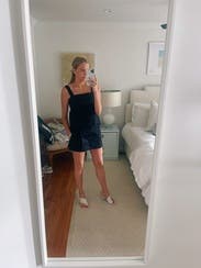 Loved this Navy skirt/skort from Tibi. It wears like a short skirt but there is a little of the built-in shorts underneath that show a little in the back. I liked it and thought it gave it dimension and a unique look. It does wrinkle easily. Such a versatile piece that can be dressed up or down. Runs a little large. I'm normally a comfortable 10 and both the 6 and 8 sizes fit me fine.