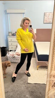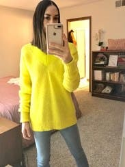 This is the perfect sweater for just about anything, work, casual date night or girls night, or just to run errands in! The sweater is super soft and comfortable. It runs large as expected granted I sized up to a medium though and was glad I did, as it was a wee bit longer in the front as I prefer. I hate the cropped oversized sweater look! The color is more like a neon yellow in person, which again, I loved it! This is a sweater I would love to buy in the future!