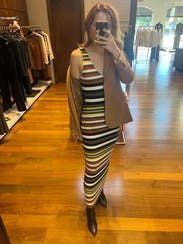 Loved the high quality knit, the rich colors and the chic column style. What keeps this from being a five are the proportions - the the torso and straps are so long coupled with the weight of the fabric left me worried about exposing my bra all day. I think the answer is I needed to be taller and longer. Too bad for me because it’s a fabulous dress