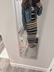 Worn to a family party 13 weeks pregnant. I wore my pre-pregnancy size (M) but I’m fitting into a street size 12/L with my bump so I recommend sizing down. It occasionally slipped down in front so you could see my bra, but it was an easy fix. Aside from that this dress was comfortable and cute, perfect with a jean jacket for a chilly late Summer evening!