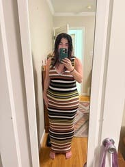 This dress was great! It fits true to size but the knit will loosen a bit as you wear it so you can size down if you’re unsure, I ordered a size down from my normal and loved it. The colors are great for late summer/fall. The fabric is thick which is very forgiving but it can get a touch hot if you’re outside.