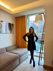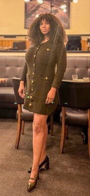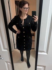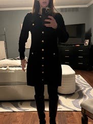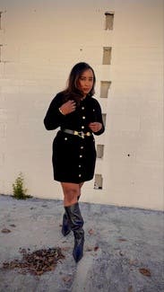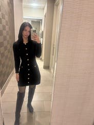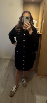 The fit was perfect—snug enough to define my waist but still very comfortable with good stretch. The length hit just above my knees, which is ideal for petite frames. The fabric is thicker and structured, which gives it a polished, high-end feel. The gold buttons elevate the look instantly, and the dress holds its shape throughout the day without sagging or stretching. I added a belt to define my waist even more, and paired it with knee-high boots for a chic, confident vibe. This dress photographs beautifully and is versatile for work events, travel, or a polished night out. Highly recommend if you want something that feels classic yet powerful.